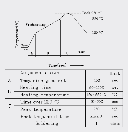 Soldering Process: Hand soldering:Use a soldering iron of 30 watts, controlled at 380℃ approximately 3 seconds while applying solder.
